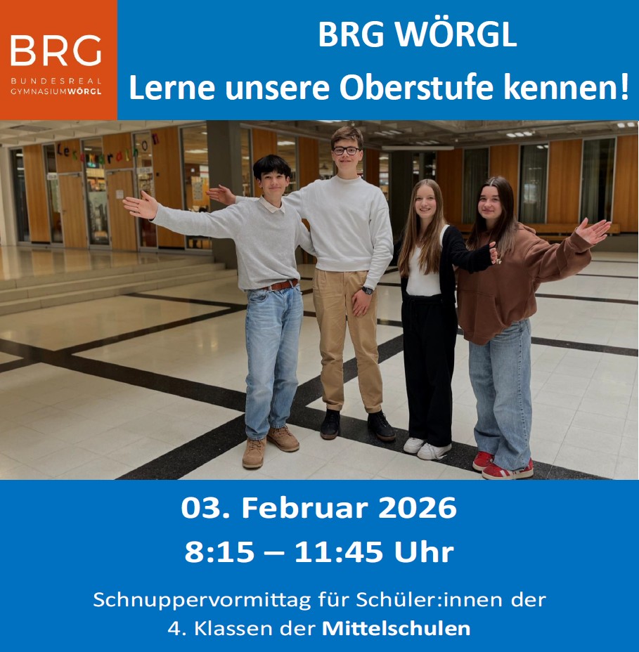 Am Dienstag, den 03. Februar 2026, hast du die Gelegenheit, die Oberstufe des BRG Wörgl näher kennenzulernen. Es erwarten dich interessante Einblicke in den Schulalltag und Wissenswertes zu deiner beruflichen Zukunft! Wir zeigen dir, wie du nach der MS in nur vier Jahren eine breite Allgemeinbildung mit Matura bekommst. Mit der Matura eröffnest du dir viele berufliche Chancen. Außerdem bist du auch für ein Studium sehr gut vorbereitet.