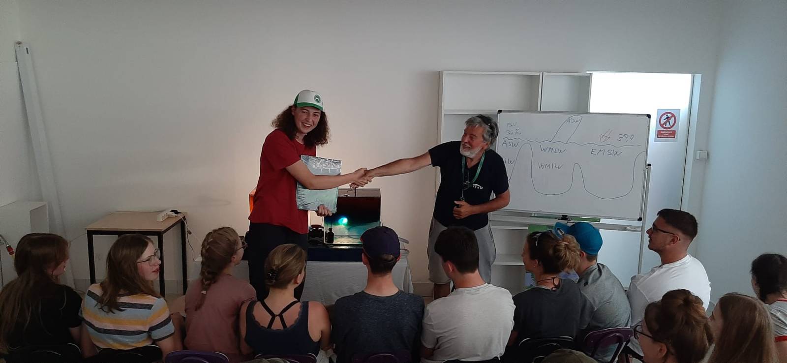 Beim Strömungsexperiment veranschaulichte uns Dr. Robert Hofrichter die Wasserbewegungen im Mittelmeer und anderen Gewässern. Florian durfte sich außerdem über einen Buchpreis freuen.